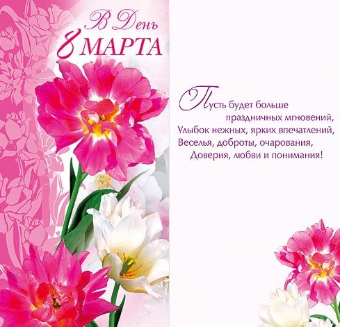 Пусть всегда женский день не кончается Пусть поют в Вашу честь ручейки Пусть солнышко Вам улыбается И мужчины Вам дарят цветы с первой капелью,с последней метелью С ПРАЗДНИКОМ РАННЕЙ ВЕСНЫ Вас Поздравляем,Сердечно Желаем -РАДОСТИ,СЧАСТЬЯ,ЗДОРОВЬЯ,ЛЮБВИ!!!!!!!!!!!!!!!!!!!!!!!!!!!!!!! С Праздником Девченки!!!!!!!!!!!!!!!!!!!!!!!!!!!!