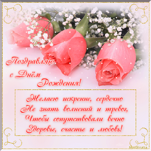 Дорогая моя Иринка!!! Пусть в этот день тебя встречает солнце, И пенье птиц, и легкий ветерок, И птица счастья постучит в оконце, И лучший друг придет на твой порог. Я от души тебе любви желаю, Здоровья крепкого, и жизни без потерь! Тебя я с Днем рожденья поздравляю, Пусть радость к тебе в дом откроет дверь.