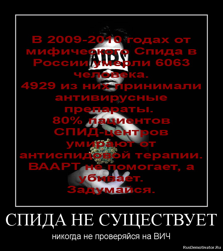 Ну и что там про кошмары? Кошмар, это когда 80% умирают от терапии, о чём выше сказано. А Африка далеко, про неё вообще можно всё что угодно писать. А кто помнит Риана Малана в "Доме чисел", так он днём с огнём искал этих умерших от Спида в ЮАР, и не нашёл. Более того, там похоронные конторы просто разорились в разгар "эпидемии", хоронить некого было. И население ЮАР за "эпидемию в 2 раза выросло. И где Спид? Давайте российскую статистику обсудим. 15600 умерших на фоне Спида за всю эпидемию. Из них только за 2009-10 годы 5000 человек умерли принимая ВААРТ. Вот это давай обсудим. Они от ВААРТ умерли, или как?