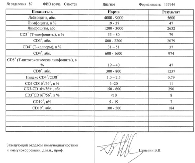 Здравствуйте, помогите пожалуйста понять результаты. т-хелперы%(cd45/cd3+/cd4+)-13%; т-хелперы(cd45/cd3+/cd4+)-244кл/мкл; т-цитотокс%(cd45/cd3+/cd8+)-60%; т-цитотокс(cd45/cd3+/cd8+)-1113 кл/мкл; cd4/cd8 -0.22 и ура! впервые за 1,5 года терапии ВН - не обнаружена