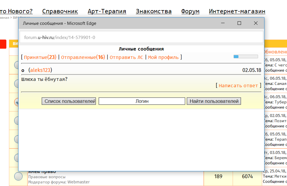 Цитата Лидия4 (  ) Мне тут в личку написал один: "Ты наверное шлюха, раз у тебя есть знакомые с ВИЧ." Скиньте скрин сообщения с никнеймом мне.